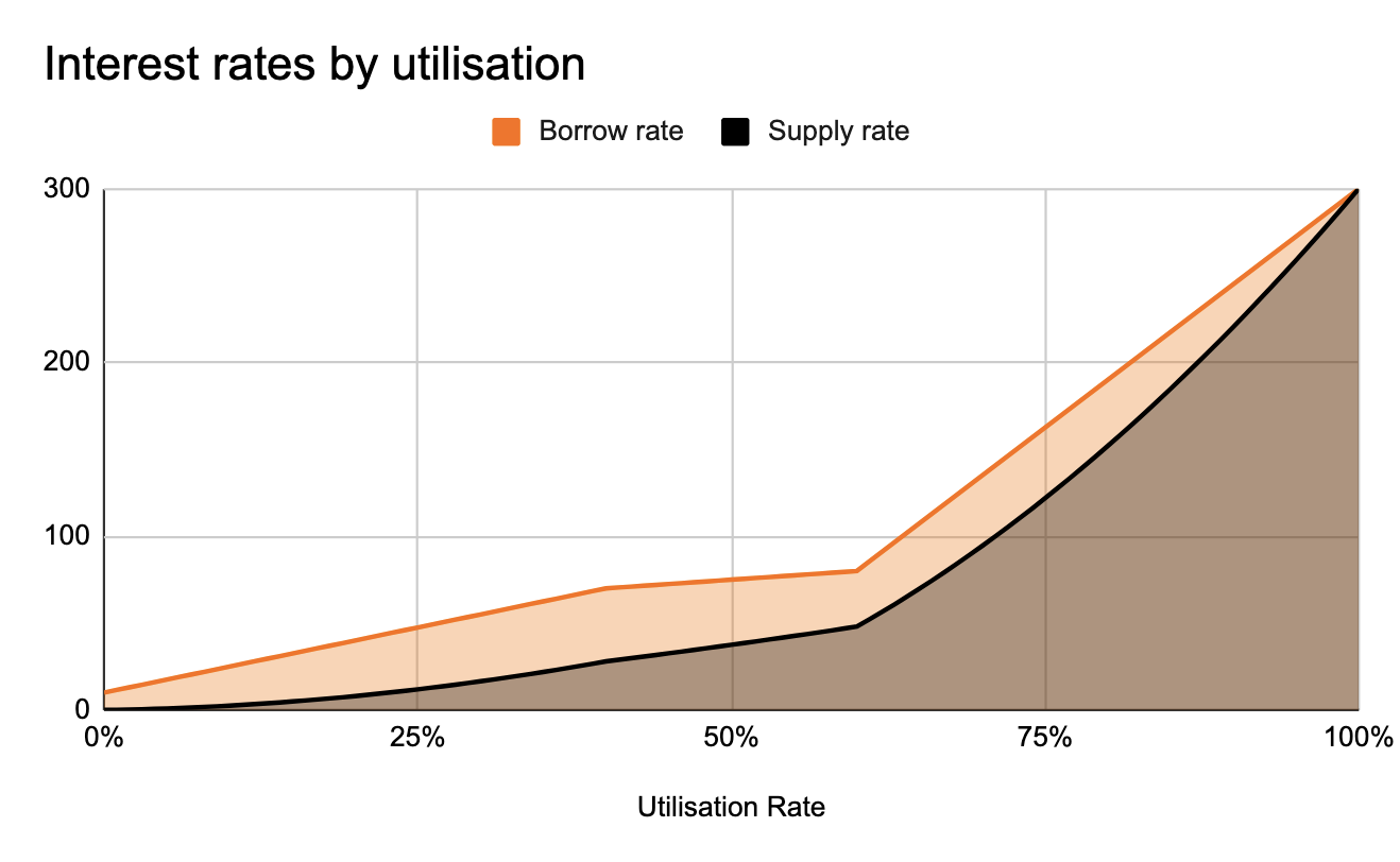 The less supplied funds are being utilised, the less supplied funds earn interest. As more of the supplied funds earn interest, the spread between interest paid by borrowers and earned by lenders tightens.t