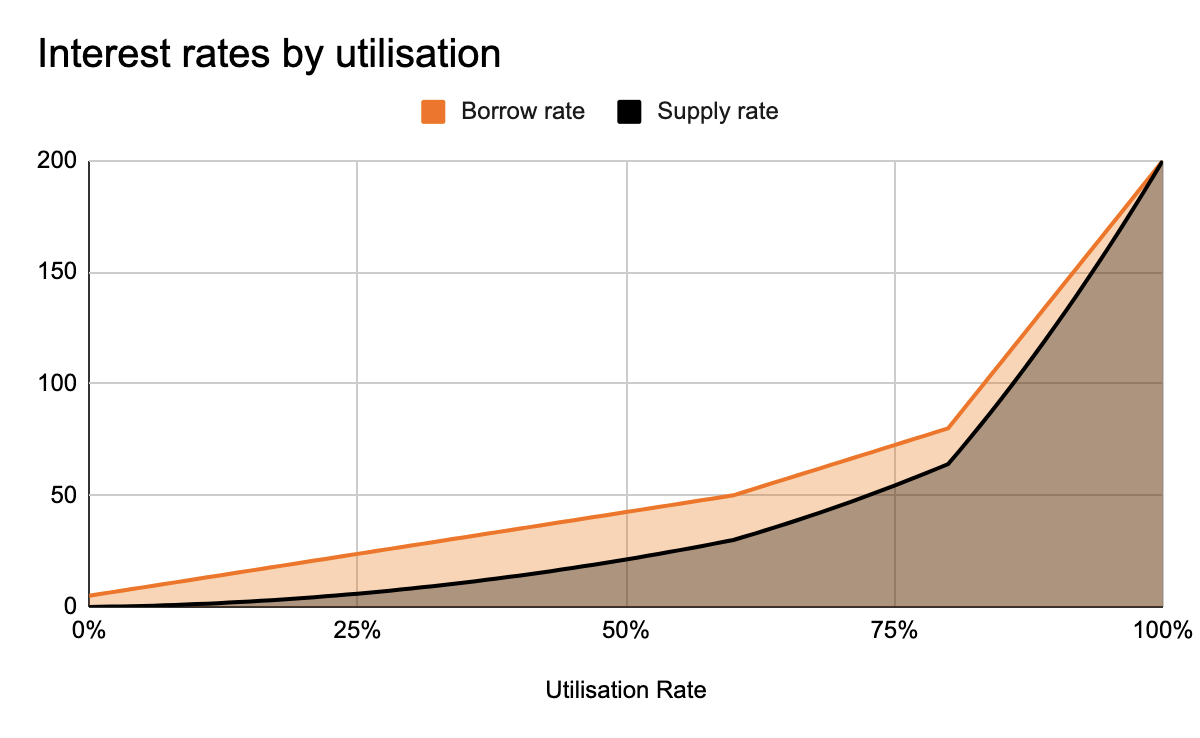 <table><thead><tr><th width="234">Utilisation rate</th><th>Borrow APR</th><th>Supply APR</th></tr></thead><tbody><tr><td>0%</td><td>5.00%</td><td>0%</td></tr><tr><td>5%</td><td>8.75%</td><td>0.44%</td></tr><tr><td>10%</td><td>12.50%</td><td>1.25%</td></tr><tr><td>15%</td><td>16.25%</td><td>2.44%</td></tr><tr><td>20%</td><td>20.00%</td><td>4.00%</td></tr><tr><td>25%</td><td>23.75%</td><td>5.94%</td></tr><tr><td>30%</td><td>27.50%</td><td>8.25%</td></tr><tr><td>35%</td><td>31.25%</td><td>10.94%</td></tr><tr><td>40%</td><td>35.00%</td><td>14.00%</td></tr><tr><td>45%</td><td>38.75%</td><td>17.44%</td></tr><tr><td>50%</td><td>42.50%</td><td>21.25%</td></tr><tr><td>55%</td><td>46.25%</td><td>25.44%</td></tr><tr><td>60%</td><td>50.00%</td><td>30.00%</td></tr><tr><td>65%</td><td>57.50%</td><td>37.38%</td></tr><tr><td>70%</td><td>65.00%</td><td>45.00%</td></tr><tr><td>75%</td><td>72.50%</td><td>54.38%</td></tr><tr><td>80%</td><td>80.00%</td><td>64.00%</td></tr><tr><td>85%</td><td>110.00%</td><td>93.50%</td></tr><tr><td>90%</td><td>140.00%</td><td>126.00%</td></tr><tr><td>95%</td><td>170.00%</td><td>161.50%</td></tr><tr><td>100%</td><td>200.00%</td><td>200.00%</td></tr></tbody></table>